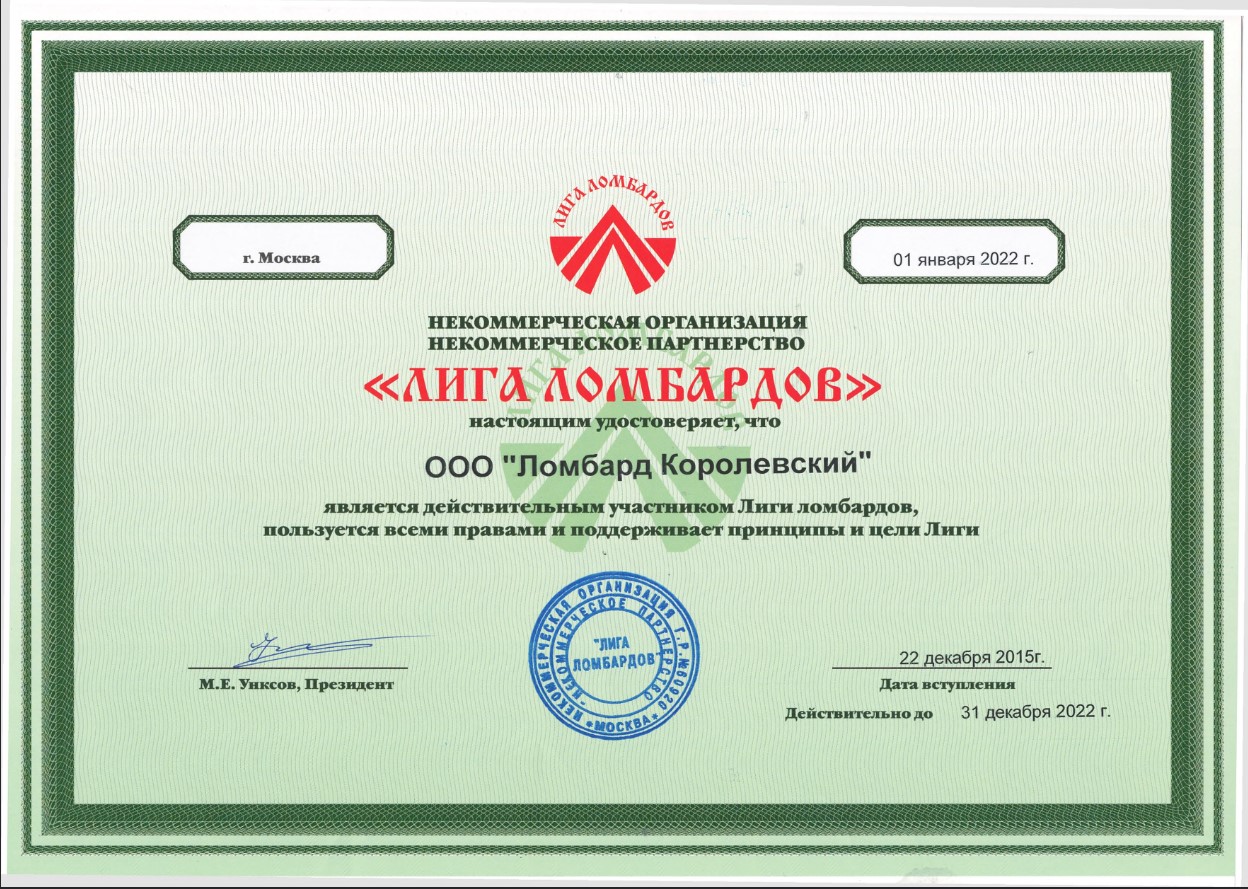 Мы являемся участниками крупнейшей некоммерческой организации "Некоммерческое партнерство "Лига Ломбардов".